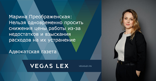 Марина Преображенская для Адвокатской газеты: Нельзя одновременно просить снижения цены работы из-за недостатков и взыскания расходов на их устранениеИсточник: Адвокатская газета Марина Преображенская, Старший юрист практики "Недвижимость. Земля. Строительство"