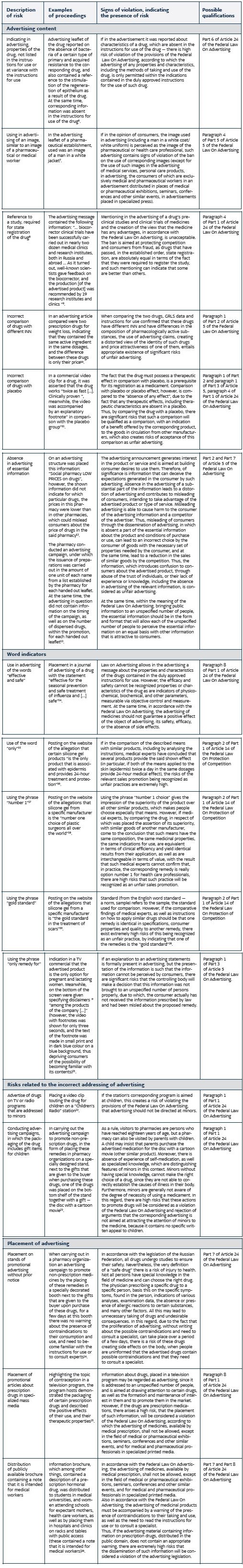 Advertising and promotion of drugs is a delicate and difficult task, since in this sphere, intersect the art of attracting attention to the product, principles of ethics, and mandatory rules of advertising legislation as well as legislation on the protection of competition. In this regard, in order to facilitate the work of advertising and creative departments of pharmaceutical companies, as well as to simplify the work of advertising agencies — the counterparties of such companies, we have prepared a summary matrix of the main risks, based on the analysis of law enforcement practice in the field of advertising of medicinal products. To do this, we analysed the practical decisions of FAS Russia and the courts for the years 2013-2014 on typical revealed violations, which occur in the advertising of medicines, as well as some practical solutions for the given period, from related industries, confirming the consistency of regulatory approaches. On the basis of this analysis, in the risk matrix below, we provide the appropriate generalizations and describe specific illustrative examples. However, we would like to turn your attention to the fact that advertising, like any creative process, is always individual, and therefore in the assessment of the possible risks (in particular in determining the content of promotional materials, the recipients of such materials and the order of placement), one must use an individual approach. Attributes of advertising In accordance with Article 3 of the Federal Law dated 13 March 2006 No. 38-FZ “On Advertising” (hereinafter referred to as the “Federal Law On Advertising”) advertising is information distributed by any means, in any form or by using any resources addressed to an unspecified group of people and aimed at drawing their attention to the object of advertising, the formation or maintenance of interest in it, and its advancement in the market. Thus, falling under the object of advertising are the goods, means of their individualization, the manufacturer or seller of the goods, and the results of intellectual activity or events, to draw attention to which the advertising is directed. Thus, on the basis of this legal regulation, as well as interpretations, given in law enforcement practice[1], it can be concluded that the information, recognized as advertising, must satisfy the following fundamental conditions, namely: (a) intended for an unspecified group of people[2] (which can – including the dissemination of information in periodic mass media, or the inclusion of relevant information in a booklet – be transmitted from one person to another, or by the holding of campaigns in pharmacies, aimed at an unspecified group of people — potential customers of pharmacies, etc.); (b) to attract, develop and sustain an interest in the object of advertising[3]; and (c) promote the object of advertising (goods) in the market. Moreover, in practice, analytical and informational materials such as articles, brochures, flyers, etc., can be classified as materials that are of an advertising nature, and therefore the advertiser’s claim that such materials are for reference use only, is not taken into account by FAS Russia and the courts. For example, information about a drug, which was placed in a separate unit next to an article in a magazine about beauty and health[4], FAS Russia, in its Decision on Case No. RTS.08.12.58 dated 22 November 2012, recognized as advertising, despite arguments that this information is analytical material in which the object of advertising is not visible, because there is no information about the manufacturer, and place of distribution of said preparation. In addition, the courts can reject the argument that a leaflet of a pharmacy organization (including those containing information on prescription medicines) is aimed at promoting the trademarks of their respective network of pharmacies, not at advertising specified in the booklet medicines. For example, in the Decision on Case No. A56- 74059/2013 dated 29 July 2014, the Thirteenth Arbitration Court of Appeals found that a booklet of a pharmacy organization lacked any significant information about the trademark (service mark or other means of individualization of a legal entity — the pharmacy organization), but listed were addresses of pharmacies, provided was information on applicable discount system in pharmacies, and the remaining pages contained information about medicines and services of partners of the corresponding pharmacy organization. In this regard, the court found no basis for concluding that the contained on these pages information about medicines was aimed at drawing attention to any other object of advertising, except for the actual drugs. The Decision of OFAS Moscow Region on Case No. 08-21/1-14 dated 10 July 2014, also shows that as advertising can be considered the publication of information in print mass media about a particular pharmacy, indicating the names of medicines and their prices, despite the arguments of the pharmacy that such information belonged to reference and informational materials. As another example, we can mention the Decision of the Novgorod OFAS on Case No. 13, dated 22 October 2014, imposing a fine for an administrative offense. In it, the antitrust authority rejected the arguments that the broadcasting of the TV show “Beauty and Health” was not advertising, but rather informational in character. During examination, the antitrust body established that: (i) these broadcasts contained detailed information about certain products — progressive optical lenses and eyeglass lenses of a particular brand; and (ii) before the end of the TV show, broadcast was information in text form, which in the context of the preceding program content, obviously pointed to a specific entity to which one could turn to obtain the relevant goods. In this regard, the antitrust body concluded that these broadcasted TV programs “Health and Beauty”