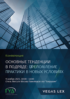 Юридическая фирма VEGAS LEX совместно с Российской гильдией управляющих и девелоперов приглашают вас к участию в конференции "Основные тенденции в подряде: преломление практики в новых условиях", которая состоится 9 ноября 2023 года в 10:30 в гибридном формате (очно / онлайн) по адресу г. Москва, ул. Бахрушина, д. 11, Отель Mercure Москва Павелецкая, зал «Бахрушин».