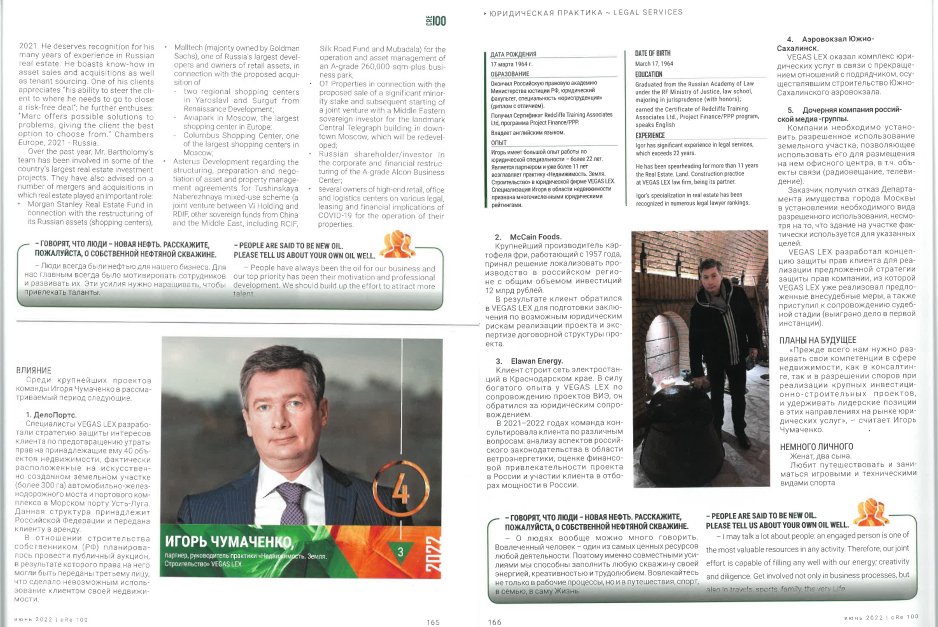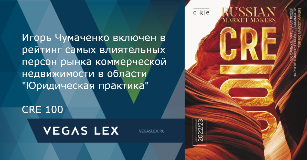 Игорь Чумаченко, партнер, руководитель Практики "Недвижимость. Земля. Строительство", включен в рейтинг самых влиятельных персон рынка коммерческой недвижимости в области "Юридическая практика" CRE 100 в 2022 г.