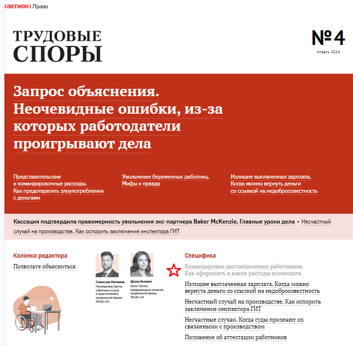 Станислав Матюшов и Диана Болевич для журнала "Трудовые споры": Командировки дистанционных работников. Как оформлять и какие расходы возмещать