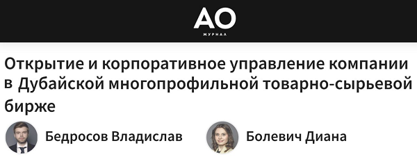 Владислав Бедросов и Диана Болевич для журнала "Акционерное общество": Открытие и корпоративное управление компании в Дубайской многопрофильной товарно-сырьевой бирже